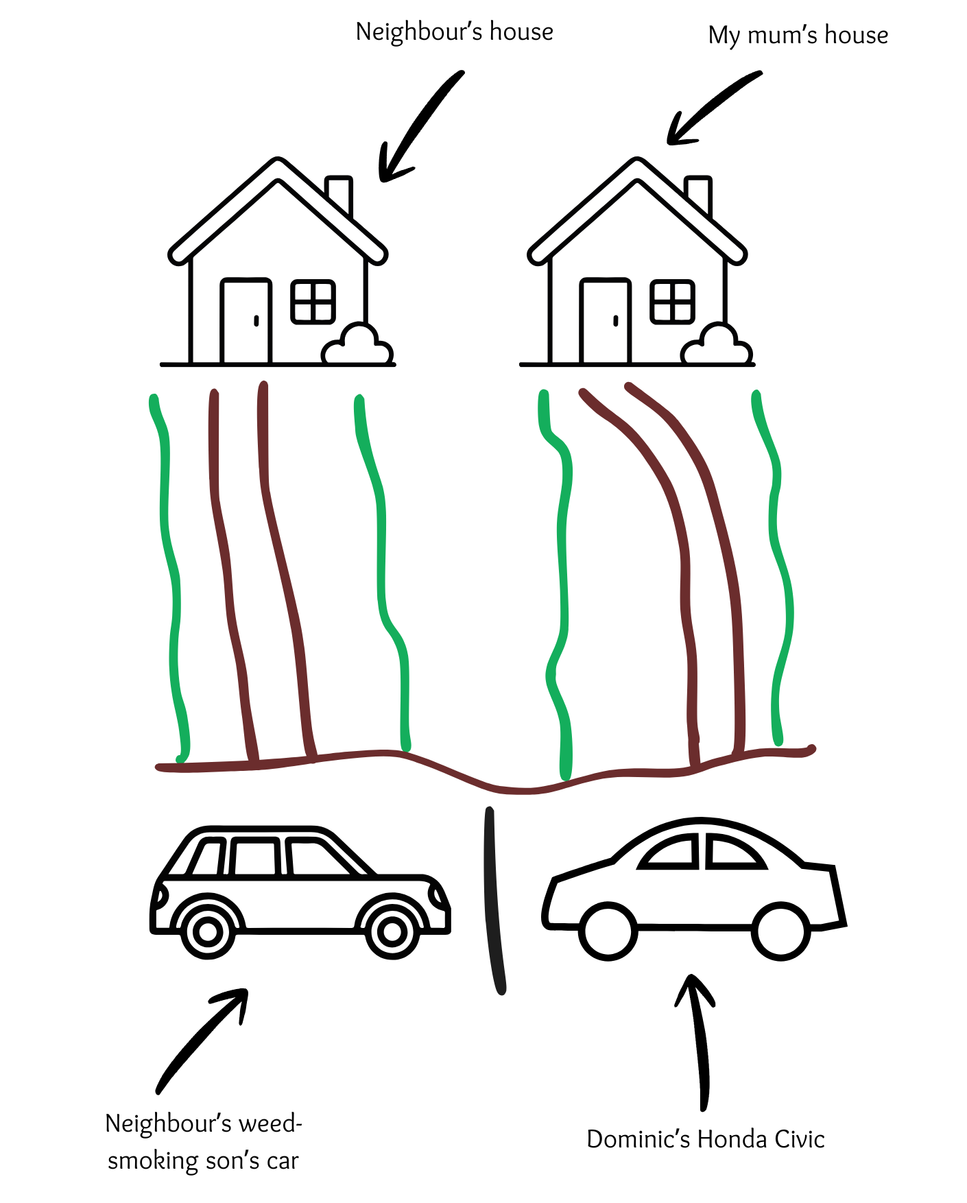 More context: my mum’s next-door neighbour is an 80-year-old woman. Her 50-year-old son lives with her (let’s call him Jim). Jim smokes weed, but his mum doesn’t know he smokes weed, so he often sneaks out of the house to smoke in the car. The road has designated street parking. Below is a diagram of how this looks.